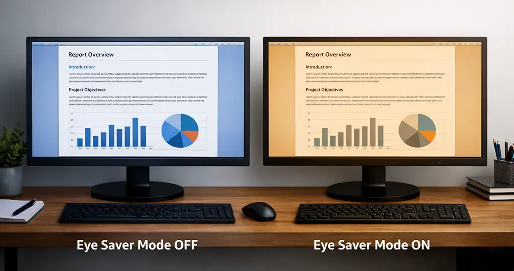 Режим “Eye Saver” — это встроенная функция монитора, предназначенная для более комфортного просмотра экрана за счёт снижения нагрузки на глаза. При включении этого режима цветовая температура смещается в сторону более тёплых тонов, уменьшается количество синего света и смягчаются тёмные оттенки — то есть устраняются резкие переходы, которые утомляют глаза. Тёплые цвета обычно выглядят более естественно и меньше напрягают зрение.
