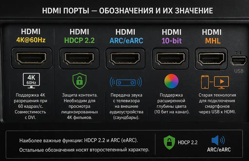 HDCP 2.2 и ARC — действительно важные функции, тогда как остальные обозначения имеют второстепенное значение.