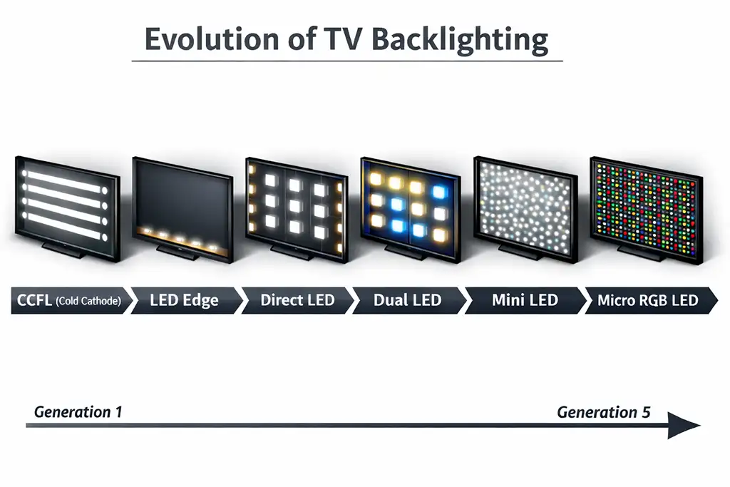 Подсветка Micro LED является результатом последовательной эволюции технологий подсветки телевизоров и может рассматриваться как пятая стадия этого развития. В первом поколении использовались люминесцентные лампы с холодным катодом (CCFL). Затем появилась светодиодная краевая подсветка LED Edge, после нее — Direct LED. Позднее были разработаны системы Dual LED, в которых к подсветке добавили синий светодиод. Следующим этапом стала технология Mini LED, где крупные светодиоды были заменены на более мелкие, что позволило увеличить их количество и улучшить управление яркостью. Подсветка Micro LED является следующим шагом и использует три отдельных светодиода — красный, зеленый и синий.