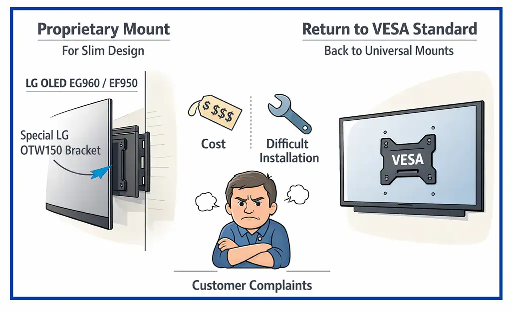 В ответ на критику LG в последующих поколениях OLED-телевизоров вновь начала поддерживать универсальный стандарт VESA. Опыт с сериями EG960 и EF950 показал, что рынок не был готов отказаться от привычных решений крепления. Стоит отметить, что LG была не единственной компанией, экспериментировавшей с фирменными системами монтажа, однако такие решения в итоге не получили широкого распространения.