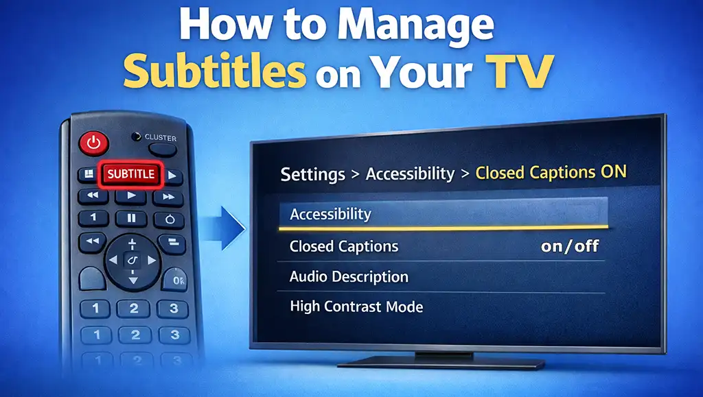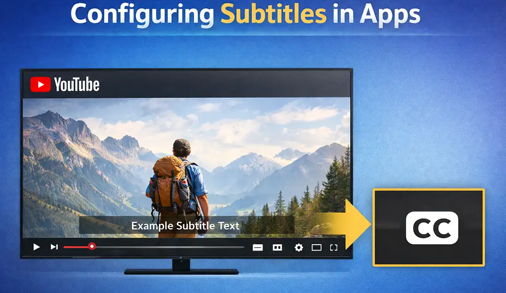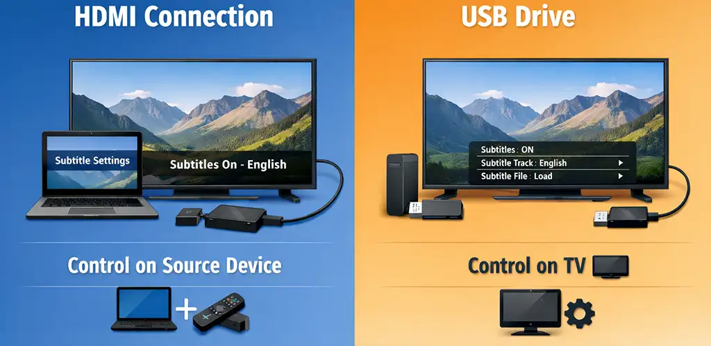 При подключении через HDMI телевизор получает уже готовый видеосигнал с встроенными субтитрами. Другими словами, телевизор фактически выступает как монитор. Это означает, что все настройки — включение или отключение субтитров, выбор языка или формата отображения — выполняются на источнике сигнала, например, ноутбуке или стриминговом устройстве, таком как Amazon Fire TV Stick.