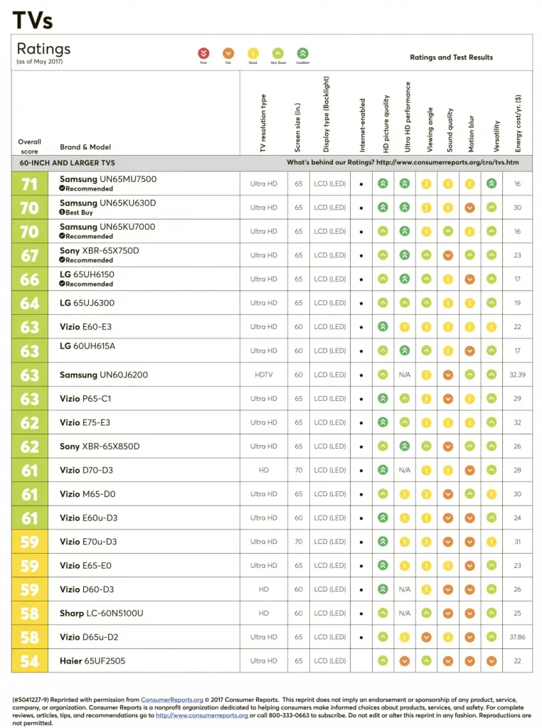 В мае 2017 года был опубликован рейтинг телевизоров, составленный на основе тестов Consumer Reports. В исследование вошли модели, официально представленные на рынке, прежде всего в Северной Америке, однако методика оценки делает результаты актуальными и для других регионов. Телевизоры сравнивались не по маркетинговым характеристикам, а по реальному качеству изображения, удобству использования и энергоэффективности.